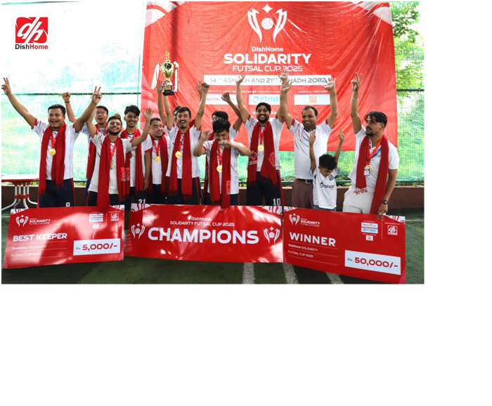 डिशहोमले आयोजना गरेको पहिलो ‘डिशहोम सोलिडारिटी फुटसल कप २०२५’ सम्पन्न भएको छ । भैँसेपाटीस्थित वन ट्री हिल फुटसलमा व्यावसायिक साझेदार कम्पनीबीच असार १४ र २१ गते आयोजित फुटसल प्रतियोगितामा १४ कम्पनीलाई प्रतिनिधित्व गर्दै १७ टिम सहभागी भएका थिए ।