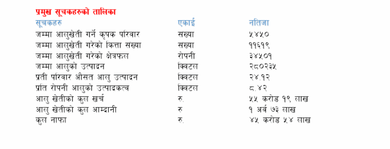 सर्वेक्षण अनुसार कुल आलु उत्पादनमा प्रतिशतका आधारमा जनकदेव सबैभन्दा बढी ६४.४९ प्रतिशत उत्पादन भएको छ भने क्रमशः डेजिरे (झप्री) १७.०३ प्रतिशत, खुमल सेतो – एक ७.१० प्रतिशत, पनौती लोकल ३.१८ प्रतिशत, खुमल रातो– दुई ४.४३ प्रतिशत, कार्डिनल ( निलो आलु) १.३२ प्रतिशत, कुफ्री सुन्दरी ०.२९ प्रतिशत, रोजिता ०.३० प्रतिशत, खुमल उज्वल ( चिप्सको लागी । ०.१८ प्रतिशत, कुफ्री ज्योती ०.१५ प्रतिशत, एम. एस. ०.१३ प्रतिशत र अन्य १.४१ प्रतिशतमा उत्पादन भएको देखिन्छ । सर्वेक्षण अनुसार काभ्रेपलाञ्चोक जिल्लामा आलुखेती गर्ने ५,४५० कृषक परिवारमध्ये ६१६ (११.३%) ले ऋण लिएका थिए भने ४,८३४ (८८.७% ) ले कुनै ऋण नलिएको देखिएको छ। ऋण लिने कृषकमध्ये सबैभन्दा धेरै ६५.८० प्रतिशतले सहकारी संस्थाबाट ऋण लिएका छन्, त्यसपछि २०.९१ प्रतिशतले बैंक तथा वित्तिय संस्था, ५.०२ प्रतिशतले कृषक समूह, ४.८६ प्रतिशतले आफन्त वा ईष्टमित्र, २.११ प्रतिशतले महिला समूह तथा १.३० प्रतिशतले अन्य स्रोतहरूबाट ऋण लिएको देखिन्छ । किटनासक प्रयोग गर्ने ८०.४७ प्रतिशत र प्रयोग नगर्ने १९.५३ प्रतिशत कृपक परिवार रहेका छन् । जसमध्ये, कटनासक प्रयोग गर्ने कृषकहरूमा २५.४३ प्रतिशतले सुरक्षित (हरियो), ६२.४२ प्रतिशतले मध्यम खालको (निलो), १०.८३ प्रतिशतले कडा (पहेलो) र १.३१ प्रतिशतले अतिकडा (रातो) को कीटनाशक प्रयोग गरेका थिए । सर्वेक्षण अनुसार, जम्मा १,२९,६९२ जनाले आलुखेतीमा संलग्न रहेकोमा ८०,४९४ महिला र ४९,१९८ पुरुष रहेका छन्, जहाँ महिलाको औसत पारिश्रमिक ७८१ रुपैयाँ प्रतिदिन र पुरुषको औसत पारिश्रमिक १,०५८ रुपैयाँ प्रतीदिन रहेको छ । काभ्रेपलाञ्चोक जिल्लामा आलुखेतीबाट कृपकहरूले कुल १ अर्ब ७३ लाख रुपैयाँ आम्दानी गरेका छन् भने कुल खर्च ५५ करोड १९ लाख रुपैयाँ रहेको छ । यसरी आम्दानी र खर्चको अन्तरका आधारमा कृषकहरूले ४५ करोड ५४ लाख रुपैयाँ नाफा आर्जन गरेको देखिएको छ ।