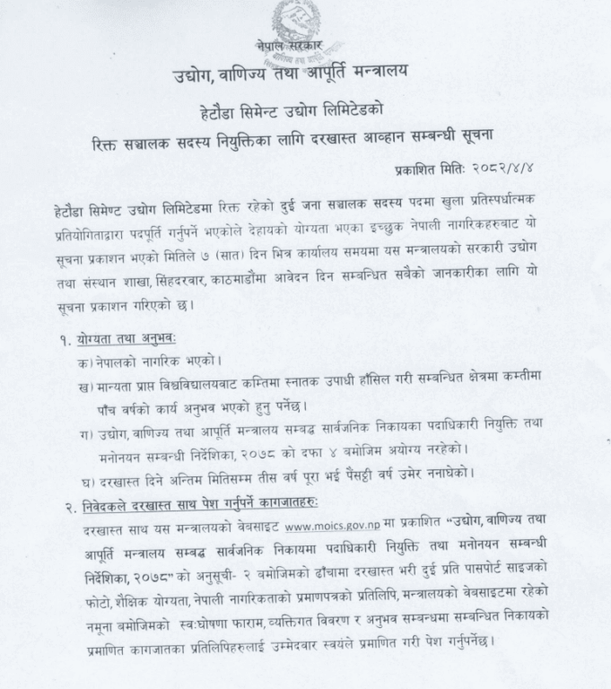 इच्छुक र योग्य नेपाली नागरिकले सूचना प्रकाशन भएको मितिले ७ दिनभित्र अर्थात् साउन १० गते कार्यालय समयभित्र सिंहदरबारस्थित मन्त्रालयको सरकारी उद्योग तथा संस्थान शाखामा आवेदन दिनुपर्ने सूचनामा उल्लेख छ । आवेदनका लागि मान्यताप्राप्त विश्वविद्यालयबाट स्नातक तह उत्तीर्ण गरी सम्बन्धित क्षेत्रमा कम्तिमा पाँच वर्ष कार्य अनुभव भएको हुनुपर्नेछ । आवेदकको उमेर दरखास्त दिने अन्तिम मितिसम्म ३० वर्ष पूरा भइ ६५ वर्ष ननाघेको हुनुपर्ने सूचनामा उल्लेख छ ।
