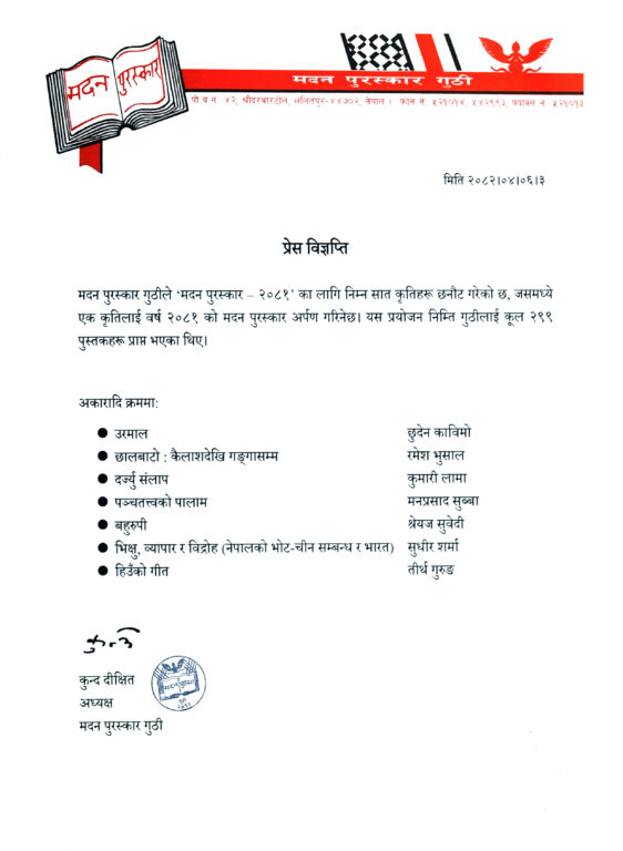 मदन पुरस्कार गुठीले २०८१ सालको मदन पुरस्कारका लागि छनौट भएका उत्कृष्ट पुस्तकहरूको सूची सार्वजनिक गरेको छ। मङ्गलबार एक प्रेस विज्ञप्ति जारी गर्दै गुठीले सात वटा कृतिहरूको नाम सार्वजनिक गरेको हो। जसमध्ये एक कृतिलाई मदन पुरस्कार अर्पण गरिनेछ।