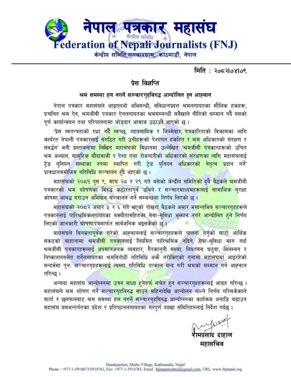 नेपाल पत्रकार महासंघले श्रम ऐन, श्रमजीवी पत्रकार ऐन तथा श्रमसम्बन्धी सेवा, सुविधा सुनिश्चित नगरे आन्दोलनमा जानुपर्ने अवस्था आउन सक्ने चेतावनी दिएको छ। महासंघका अनुसार श्रम अधिकार सुनिश्चित नगरेसम्म राष्ट्रव्यापी आन्दोलनको तयारी भइरहेको छ।
