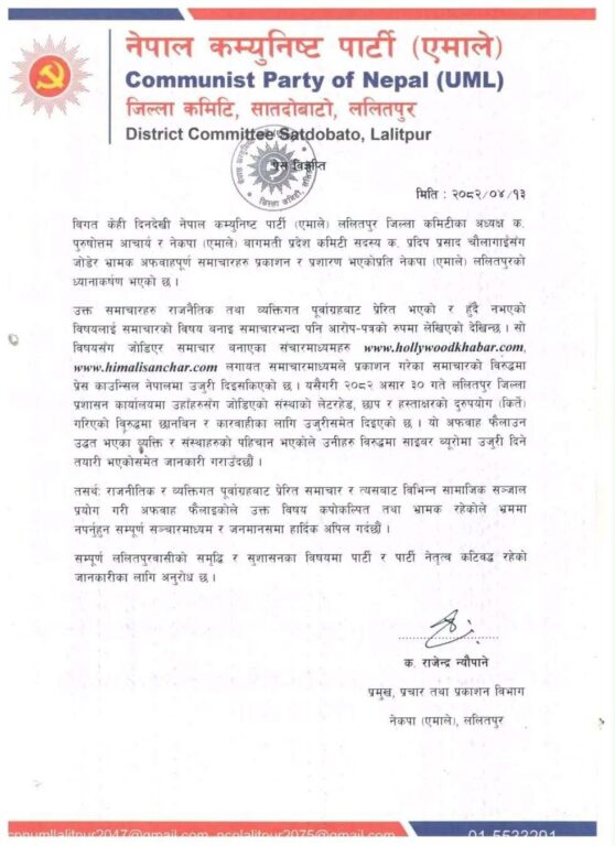 नेपाल कम्युनिष्ट पार्टी (एमाले) ललितपुर जिल्ला कमिटीले आफ्ना नेताहरूप्रति लक्षित गरी केही सञ्चारमाध्यममार्फत भ्रामक र अफवाहपूर्ण समाचार सार्वजनिक गरिएकोप्रति ध्यानाकर्षण भएको जनाएको छ।