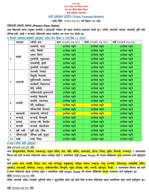 कर्णाली र महाकाली नदी सतर्कता तहमा छन् भने अन्य प्रमुख नदीहरू सतर्कता तहभन्दा तल छन्। सोमबार सिन्धुपाल्चोक, चितवन, मकवानपुर, दाङ, बर्दिया, डोल्पालगायत जिल्लाबाट बग्ने साना नदीहरूमा आकस्मिक बाढीको मध्यम जोखिम उच्च रहेको छ।