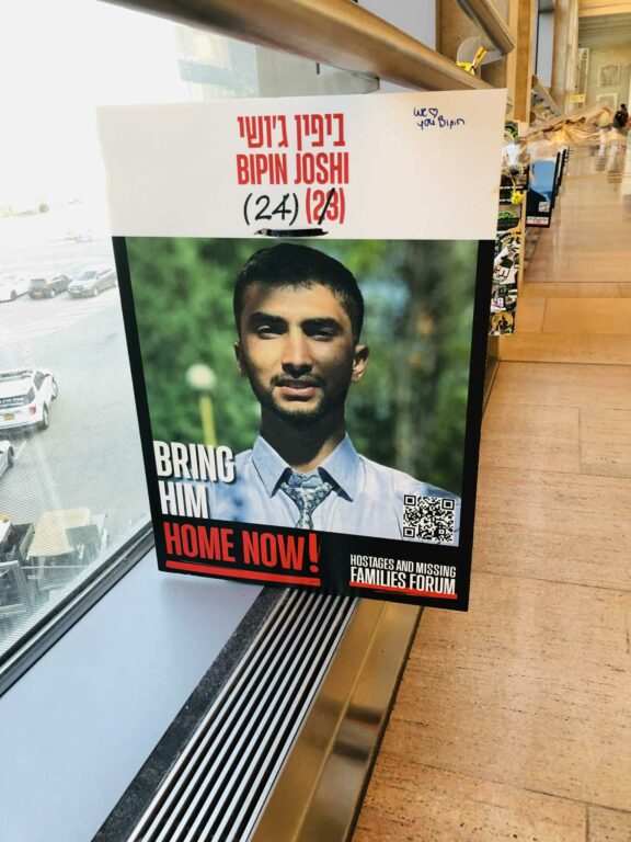 हमासको बन्धकमा रहेको विपिन जोशीलगायत सबैको तत्काल रिहाईको माग गर्दै ती सबै बन्धकका तस्विरहरू इजरायलभित्र प्रवेश गर्ने इजरायली विमानस्थलको अध्यागमन भवनदेखि शहरैभरि जताततै प्रदर्शनमा राखिएको छ ।