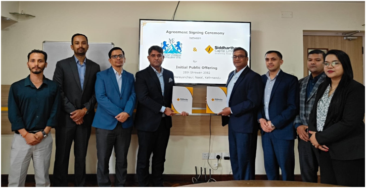 सम्झौतापत्रमा माउन्ट एभरेष्ट डिष्टिलरी लिमिटेडका प्रबन्ध सञ्चालक तीशकुमार कर्ण र सिद्धार्थ क्यापिटल लिमिटेडका प्रमुख कार्यकारी अधिकृत सन्दिप कार्कीले हस्ताक्षर गर्नुभएको छ ।