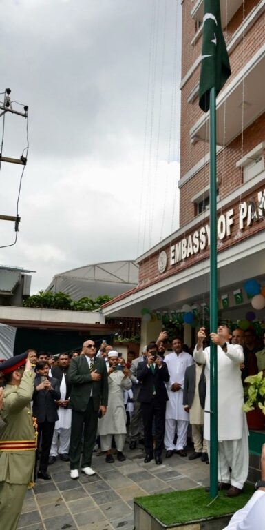 पाकिस्तानको ७९औँ स्वतन्त्रता दिवसको अवसरमा बिहीबार राजधानीस्थित पाकिस्तानी दूतावासमा झण्डोत्तोलन समारोहको आयोजना गर्यो । कार्यक्रममा पाकिस्तानका राजदूत अब्रार एच. हाश्मीले राष्ट्रिय झण्डा फहराएका थिए।