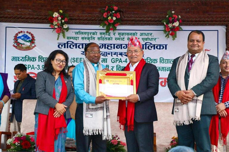 ललितपुर महानगरले २०८१ सालको माध्यमिक शिक्षा परीक्षा (एसइई)मा उत्कृष्ट अंक ल्याउने सामुदायिक र संस्थागत विद्यालयका ८६ जना विद्यार्थीलाई सम्मान सहित पुरस्कृत गरेको छ ।