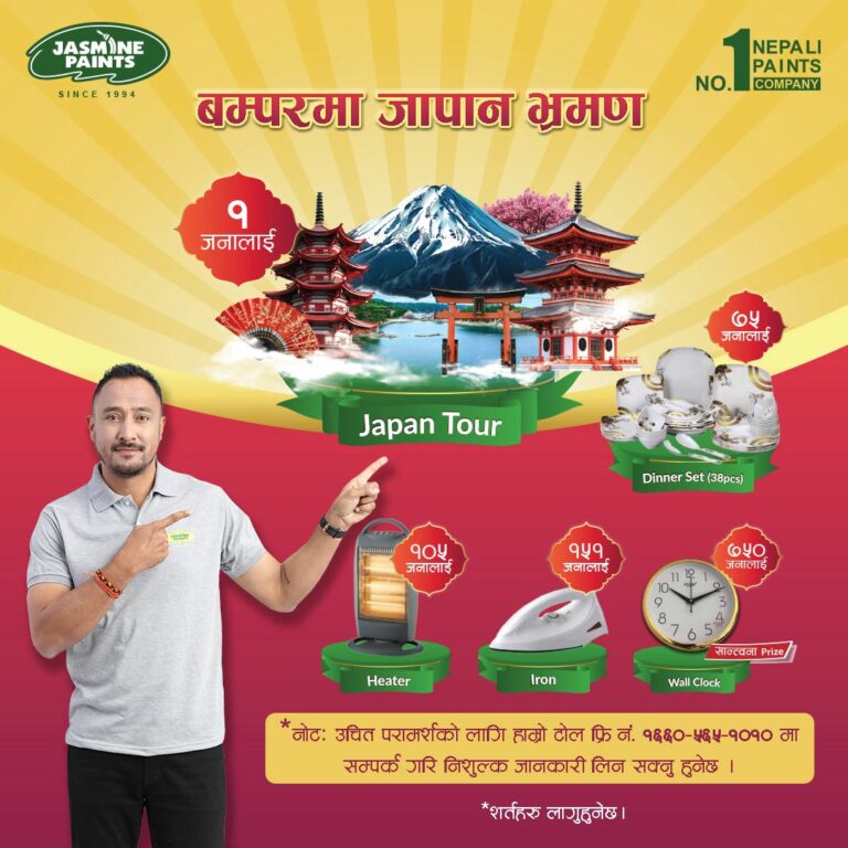 नेपाली पेन्ट्स कम्पनी मध्यकै नम्बर १ पेन्ट्स कम्पनिका रुपमा आफुलाई स्थापित गर्न सफल जस्मिन पेन्ट्सले बिगतका बर्षमा जस्तै यस बर्ष पनि “चाड पर्वको उमंग, जापान घुमौं जस्मिन पेन्ट्स सँग” ग्राहक उपहार योजना–२०८२ संचालनमा ल्याएको छ ।
