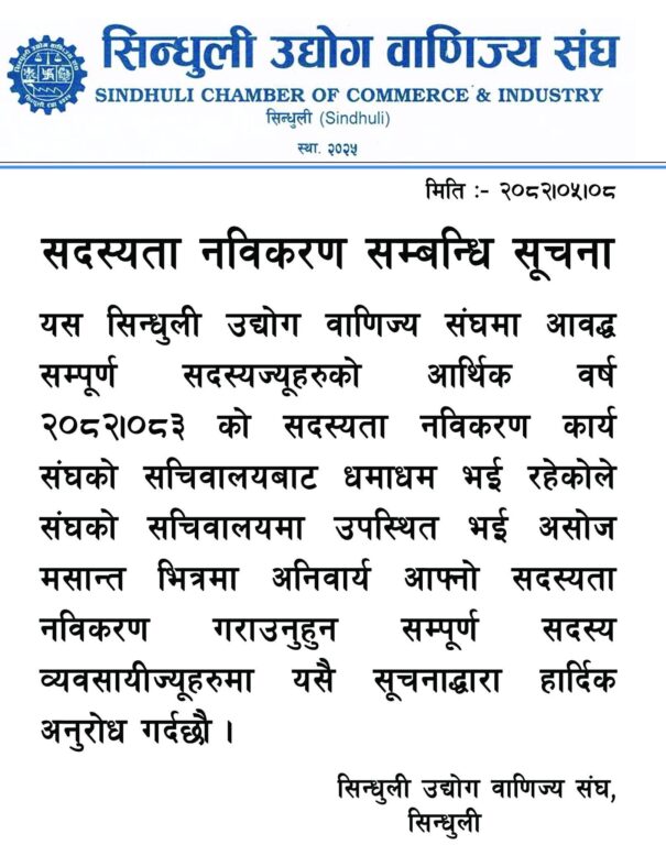सिन्धुली उद्योग वाणिज्य संघले आर्थिक वर्ष २०८१/८२ का लागि सदस्यता नविकरणको कार्य सुरु भएको जानकारी दिएको छ।