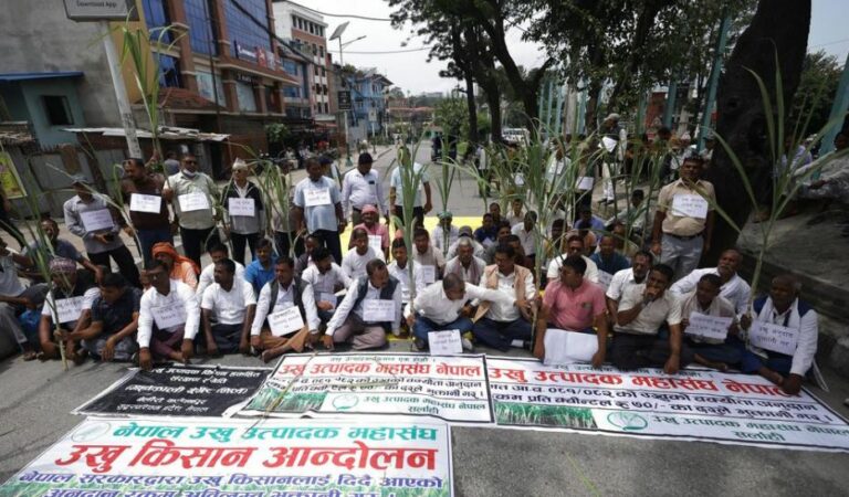 काठमाडौंको माइतीघरमा उखु किसानहरू तीन दिनदेखि धर्नामा बसेका छन्।
