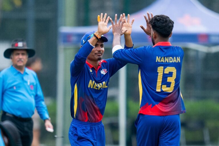 रोहित १ सय १ रनमा नटआउट रहे । उनलाई अर्को इन्डबाट सोमपाल कामीले दरो सहयोग दिए । सोमपाल ३८ रनमा नटआउट रहेका थिए । उनले यसअघि बलिङमा ३ विकेट पनि लिएका थिए ।