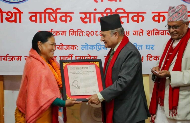 ललितपुरको इमाडोलस्थित बुद्ध पार्टी प्यालेसमा आयोजित ‘सरु संगीत घर’ संगीत विद्यालयको चौथो स्थापना दिवस एवं पुरस्कार वितरण कार्यक्रममा वरिष्ठ संगीतकार एवं प्राध्यापक दिपक जंगमले लोकगायिका आलेलाई नगद २५ हजारका साथ सम्मान पत्रसहित दोसल्ला ओढाएर सम्मान गरेका हुन् ।