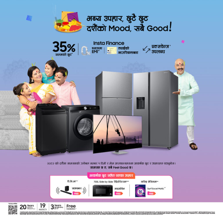 सामसङ नेपालले “दशैंको मूड, सबै गुड” अफर घोषणा गरेको छ । यस अफरअन्तर्गत नेपालभर उपलब्ध टेलिभिजन, रेफ्रिजरेटर र वाशिङ मेसिनमा विशेष छुट र उपहार पाउन सकिनेछ । अफर भदौ २५ देखि असोज २४, २०८२ (सेप्टेम्बर १० देखि अक्टोबर १०, २०२५) सम्म लागू हुनेछ । कम्पनीले यस अवधिमा ग्राहकलाई इन्स्टन्ट क्यासब्याक, उपहार र सजिलो अपग्रेड÷एक्सचेन्ज सुविधा उपलब्ध गराउने जनाएको छ ।