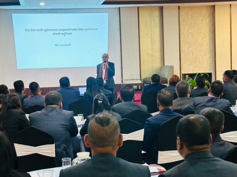 उक्त कार्यक्रममा नेपाल बीमा प्राधिकरणका कार्यकारी निर्देशक सुशील देव सुबेदी, तथा उप निर्देशक पदमप्रसाद सोडारीले तालिम प्रदान गर्नुभएको छ । उहाँले मनी लन्डरिङ र आतङ्कवादी वित्तीयकरण जस्ता विश्वव्यापी चुनौतीले बीमा क्षेत्रलाई समेत प्रभावित गर्न सक्ने भएकाले समयमै सचेत रहनुपर्ने आवश्यकता औंल्याउनु भयो ।