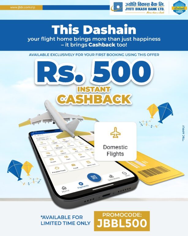 ज्योति विकास बैंकको मोबाईल बैंकिङ्ग एप ज्योति स्मार्टमार्फत हवाई टिकट खरिद गर्दा बैंकले ५ सय क्यासब्याक प्राप्त हुने योजना सार्वजनिक गरेको छ । दशैंको अवसरमा ग्राहकलाई सहज र लाभदायक यात्राको सुविधा प्रदान गर्ने उद्देश्यले बैंकले यो अफर सार्वजनिक गरेको हो ।