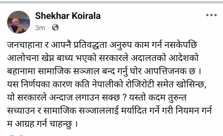 नेपाली काङ्ग्रेसका नेता डा. शेखर कोइरालाले सरकारको निर्णयको कडा आलोचना गर्दै भनेका छन् कि, अदालतको आदेशको बहानामा सामाजिक सञ्जाल बन्द गर्नु नेपाली जनताको अधिकार र रोजिरोटीमा ठुलो असर पुर्याउने कदम हो।