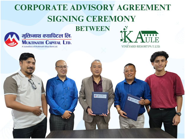 मुक्तिनाथ क्यापिटल लिमिटेड र काउले भाइनयार्ड रिसोर्ट प्रा. लि. बीच संस्थागत परामर्श सेवा सम्बन्धी दुई पक्षीय सम्झौता सम्पन्न भएको छ । मुक्तिनाथ क्यापिटलले संस्थागत परामर्श सेवा अन्तर्गत कुनै पनि क्षेत्रका कम्पनीहरुलाई कम्पनीको स्थापना काल देखि सर्वसाधारणलाई प्राथमिक शेयर निष्काशन (आइपिओ)जारी गर्ने चरणसम्म पु¥याउन आवश्यक सम्पूर्ण परामर्श सेवा उपलब्ध गराउदै आईरहेको छ । एक कार्यक्रमका बिच काउले भाइनयार्ड रिसोर्टका तर्फबाट निर्देशक इन्द्रबिर महर्जन र मुक्तिनाथ क्यापिटलको तर्फबाट प्रमुख कार्यकारी अधिकृत श्री कबिन्द्र ध्वज जोशीले उक्त सम्झौता पत्रमा हस्ताक्षर गरेका छन् ।