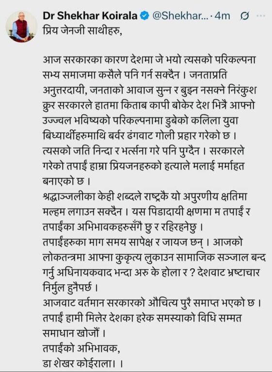 डा. कोईरालाले एक वक्तव्य जारी गर्दै भने, “हातमा किताब कापी बोकेका कलिला विद्यार्थीमाथि बर्बर ढंगले गोली चलाइएको छ, जुन अमानवीय र निन्दनीय छ।” उनले मृतकहरूप्रति श्रद्धाञ्जली अर्पण गर्दै पीडित परिवारप्रति गहिरो समवेदना प्रकट गरेका हुन् ।