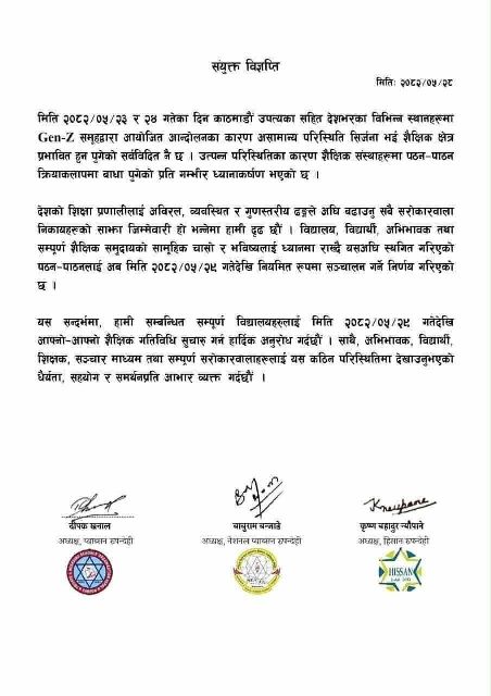 काठमाडौं उपत्यका सहित देशभर Gen-Z समूहद्वारा २०८२ भदौ २३ र २४ गते आयोजित आन्दोलनका कारण पठन-पाठन प्रभावित भएपछि स्थगित शैक्षिक क्रियाकलाप भोलि (भदौ २९) देखि पुनः सुचारु हुने भएका छन्।