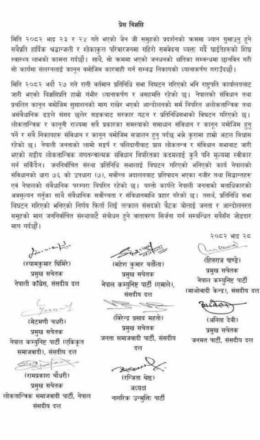 संयुक्त विज्ञप्तिमा नेपाली काँग्रेस, नेकपा (एमाले), नेकपा (माओवादी केन्द्र), नेकपा (एकीकृत समाजवादी), जनता समाजवादी पार्टी, जनमत पार्टी, लोकतान्त्रिक समाजवादी पार्टी र नागरिक उन्मुक्ति पार्टीका प्रमुख सचेतकहरूको हस्ताक्षर छ।