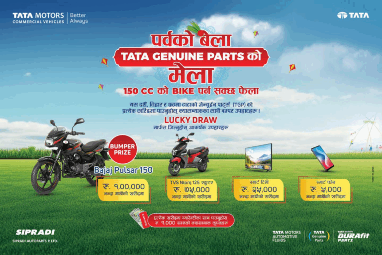 टाटा मोटर्सका टाटा जेन्युइन पाट्र्स, टाटा अटोमोटिभ फ्लुइड्स र टाटा ड्युराफिट पाट्र्सका लागि नेपालको आधिकारिक वितरक सिप्रदी अटोपाट्र्स प्रालिले पर्व लक्षित योजना सार्वजनिक गरेको छ । कम्पनीले दशैँ, तिहार र छठ पर्वको अवसरमा “पर्वको बेला टाटा जेन्युइन पाट्र्सको मेला ः प्रत्येक खरिदमा पर्न सक्छ बजाज पल्सर १५० सिसि फेला” नामक विशेष अफर ल्याएको हो ।