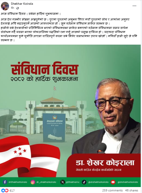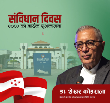 नेपाली कांग्रेसका नेता डा.शेखर कोइरालाले संविधान दिवसको अवसरमा सबैलाई शुभकामना दिँदै संविधानको रक्षा र समयानुकूल सुधार गर्दै लैजानुपर्नेमा जोड दिएका छन्।