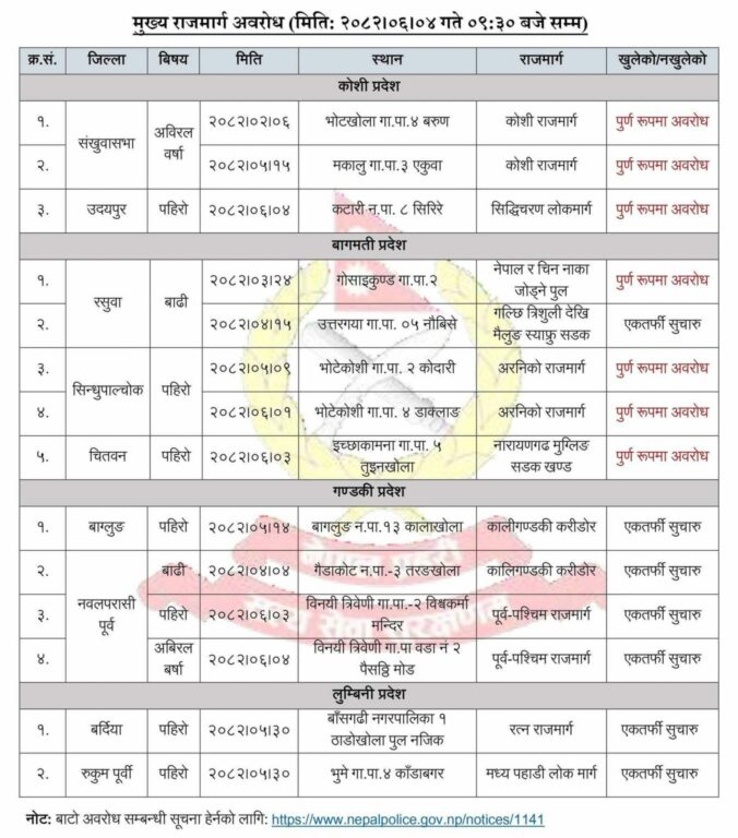 देशका विभिन्न प्रमुख राजमार्ग अवरुद्ध हुँदा यात्रुहरू अलपत्र परेका छन् । कोशी राजमार्ग, सिद्धिचरण लोकमार्ग, गल्छि–त्रिशूली सडक, अरनिको राजमार्ग, नारायणगढ–मुग्लिन सडकखण्ड, कालीगण्डकी करिडोर, पूर्व–पश्चिम राजमार्ग, रत्न राजमार्ग र मध्यपहाडी लोकमार्गका विभिन्न क्षेत्रमा सडक अवरोध भएको हो ।