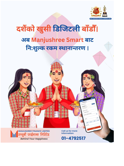 मञ्जुश्री फाइनान्स लिमिटेडले नेपालीको महान् चाड विजयादशमीको अवसरमा आफ्ना ग्राहकलाई विशेष सुविधा उपलब्ध गराउने भएको छ । यस अन्तर्गत मञ्जुश्री स्मार्ट एपमार्फत निःशुल्क रकम अन्तर गर्न सकिने व्यवस्था गरिएको छ ।