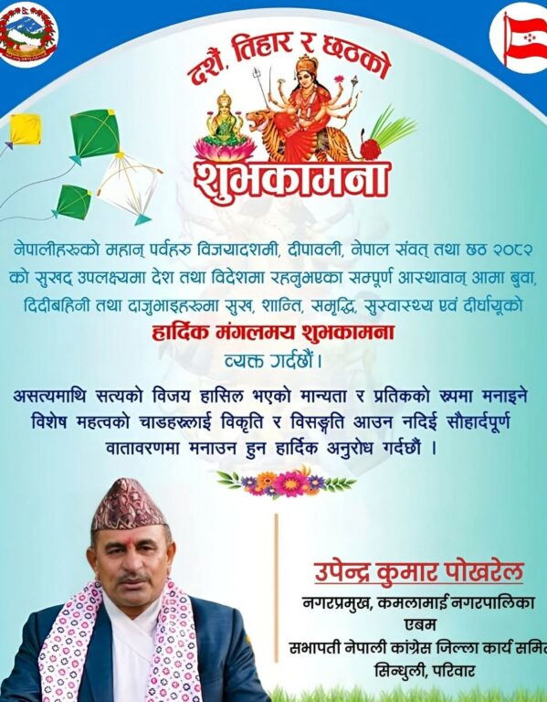 कमलामाई नगरपालिकाका नगरप्रमुख तथा नेपाली कांग्रेस जिल्ला सभापति उपेन्द्र कुमार पोखरेलले नेपालीहरुको महान् चाडहरू विजयादशमी, दीपावली, नेपाल संवत् तथा छठ पर्व २०८२ को अवसरमा देश विदेशमा रहेका सम्पूर्ण नेपालीहरूमा सुख, शान्ति, समृद्धि, सुस्वास्थ्य र दीर्घायूको कामना गर्दै हार्दिक शुभकामना व्यक्त गरेका छन्।