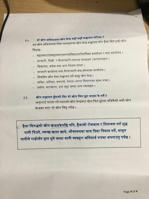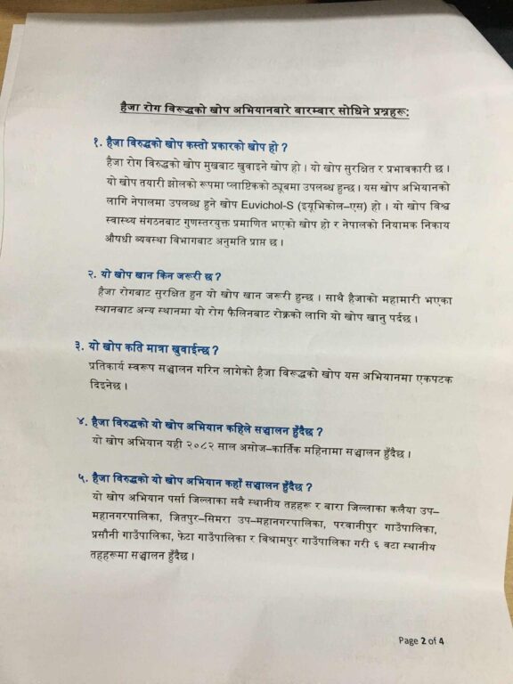उनले हैजाको अचुक उपाय खोप हैन खोप लगाएपनि सरसफाई र शुद्ध पिउने पानीमा नै जोड दिनुपर्छ । हामीले यो खोपका लागि आवश्यक तयारी गर्न दशैमा पनि काम गरेका छौं भने ।