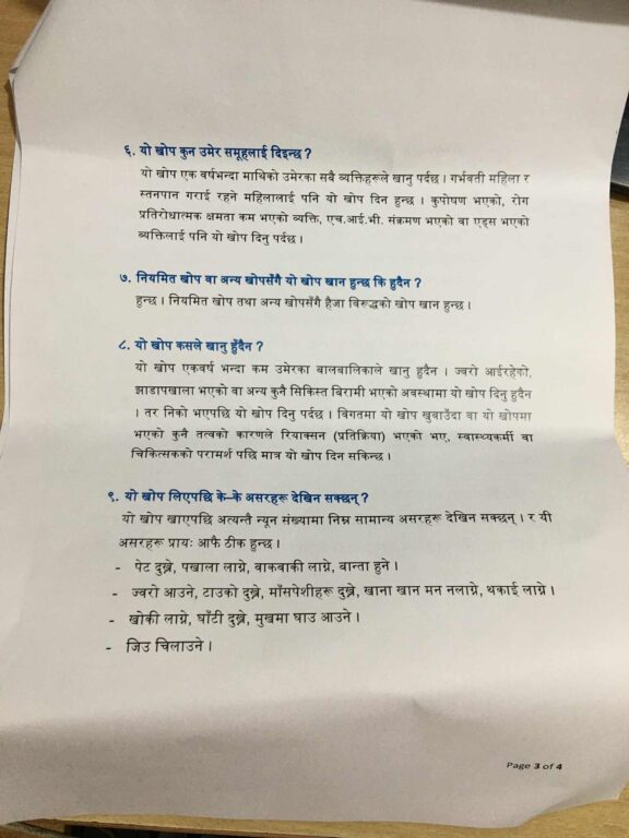 खोप लगाएको १ सातामा प्रतिरक्षा क्षमताको विकास हुने र खोपपछि कसै कसैलाई सामान्य वाक वाकी लाग्ने, पखाला लाग्ने, ज्वरो आउने, आलस्य हुने, मुखमा घाउ आउने, टाउको दुख्ने जस्ता समस्या हुन सक्छ । यसका लागि स्वास्थ्यकर्मीले तुरुन्तै आवश्यक उपचार गर्नेछन् । औषधिको स्वाद तितो हुने हुनाले सँगै पानीको पनि व्यवस्था गरिएको जानकारी गराइयो ।