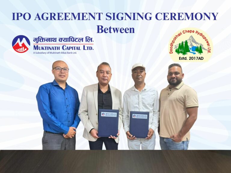 दूधपोखरी चेपे हाइड्रोपावर लिमिटेड र मुक्तिनाथ क्यापिटल लिमिटेडबीच कम्पनीको प्राथमिक सेयर (आइपिओ) जारी तथा विक्री प्रबन्ध सम्बन्धी सम्झौता सम्पन्न भएको छ । यस सम्झौताअन्तर्गत मुक्तिनाथ क्यापिटलले दूधपोखरी चेपे हाइड्रोपावरको आईपीओ निष्काशन तथा बिक्री प्रबन्धक (इसु म्यानेजर)को रूपमा कार्य गर्नेछ । एक कार्यक्रमका बिच दूधपोखरी चेपे हाइड्रोपावरका तर्फबाट अध्यक्ष सबिन प्रधानाङ्गले र मुक्तिनाथ क्यापिटलका तर्फबाट प्रमुख कार्यकारी अधिकृत कविन्द्र ध्वज जोशीले उक्त सम्झौता पत्रमा हस्ताक्षर गर्नुभएको छ ।