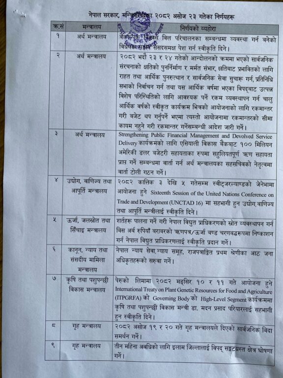 सरकारले मन्त्रिपरिषद् बैठकका निर्णय सार्वजनिक गरेको छ । शुक्रबार सरकारका प्रवक्ता एवम् सञ्चार तथा सूचना प्रविधिमन्त्री जगदीश खरेलले पत्रकार सम्मेलन गर्दै असाेज २३ गतेको मन्त्रिपरिषद् बैठकका निर्णय सार्वजनिक गरेका हुन् ।