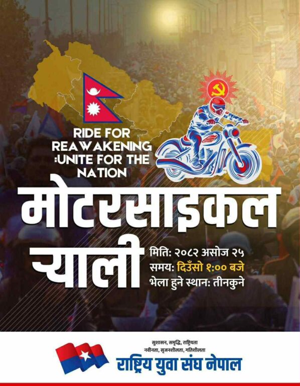 शुक्रबार रिपोर्टस क्लबमा पत्रकार सम्मेलन गर्दै राष्ट्रिय युवा संघ नेपालले शनिबार आयोजना गरिएको मोटरसाइकल र्याली स्थगित गर्दै २४ घण्टाभित्र आइतबार यसका लागि स्वीकृति दिनुपर्ने भन्दै अल्टिमेटम दिएको हो ।