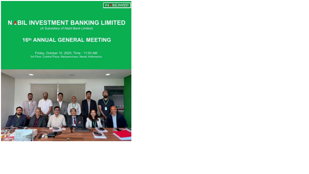 नबिल इन्भेष्टमेन्ट बैंकिंङ्ग लिमिटेडले आज असोज २४ गते सोह्रौं बार्षिक साधारण सभा सम्पन्न गरेको छ । कम्पनीक अध्यक्ष सुजित कुमार शाक्यको अध्यक्षतामा सम्पन्न उक्त साधारण सभामा संचालक समितिका सदस्यहरु, शेयरधनी महानुभावहरु तथा कम्पनीको व्यवस्थापन समितिका सदस्यहरुको उपस्थिती रहेको थियो ।
