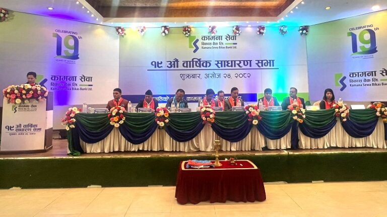 कामना सेवा विकास बैंक लिमिटेडको १९औं वार्षिक साधारणसभाले सेयरधनीलाई १५ प्रतिशत बराबर लाभांश दिने प्रस्ताव पारित गरेको छ ।