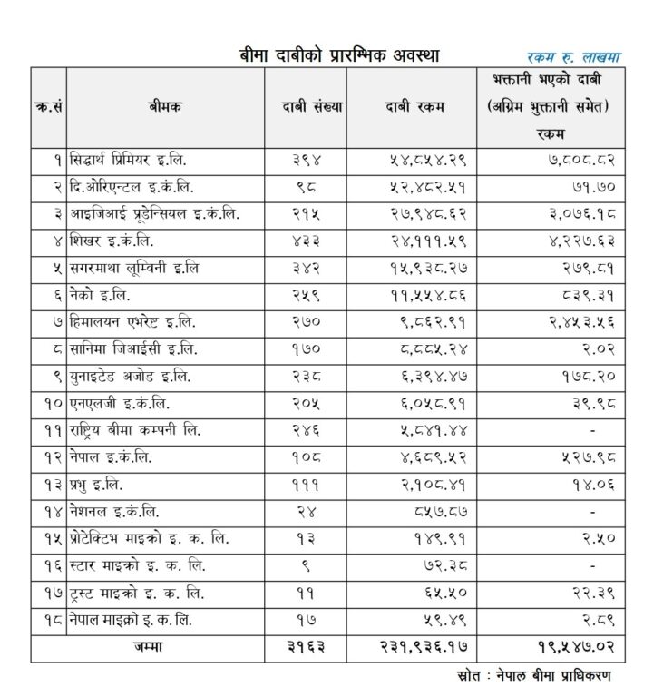 हालसम्म कम्पनीहरूले अग्रिम भुक्तानीसहित १ अर्ब ९५ करोड रुपियाँ बराबरको दाबी भुक्तानी गरिसकेका छन् । प्राधिकरणका अनुसार सबैभन्दा धेरै दाबी सिद्धार्थ प्रिमियर इन्स्योरेन्समा परेको छ, जसमा मात्रै ३९४ वटा दाबीबाट ५ अर्ब ४८ करोड रुपियाँको दाबी दर्ता भएको छ । सो कम्पनीले हालसम्म ७८ करोड रुपियाँभन्दा बढी भुक्तानी गरिसकेको छ । सो दाबीमध्ये भाटभटेनी सुपरमार्केटको क्षति सबैभन्दा ठूलो भएको बताइएको छ ।