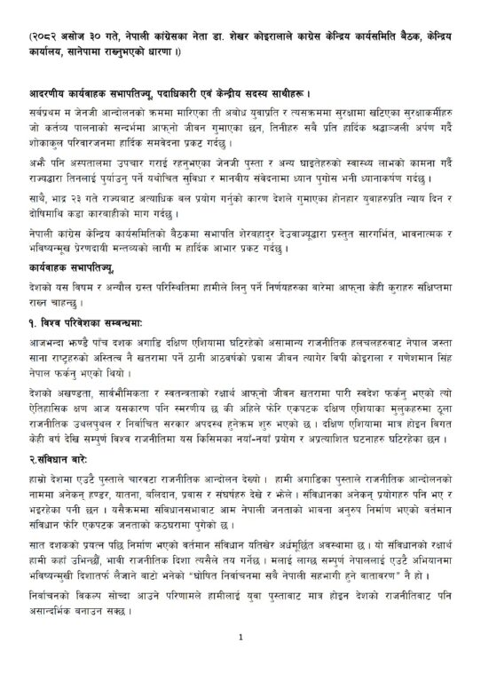 कोइरालाले जेनजी आन्दोलनका क्रममा मारिएका युवा तथा सुरक्षाकर्मीप्रति श्रद्धाञ्जली अर्पण गर्दै दोषीमाथि कडा कारबाही हुनुपर्ने जिकिर गरे । उनले सरकारलाई त्रासमुक्त वातावरणमा स्वतन्त्र निर्वाचन सम्पन्न गर्न आवश्यक पूर्वाधार तयार गर्न आग्रह गरे।