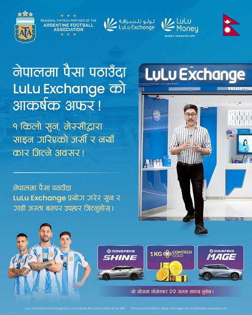 युएईमा रहेका नेपालीहरूले लुलु एक्सचेन्जमार्फत नेपालमा पैसा पठाउँदा १ किलो कोमटेक सुन, दुई मेगा पुरस्कार डोंगफेंग साइन कार र डोंगफेंग म्याज कार, र लायोनल मेस्सीले हस्ताक्षर गरेको अर्जेन्टिनाको फुटबल जर्सी जित्न सक्नेछन् ।