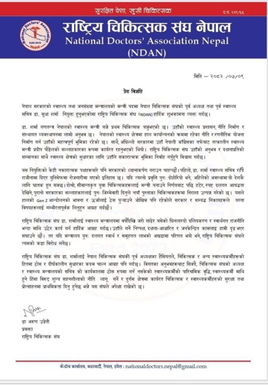 संघका महासचिव डा. सञ्जीव तिवारीले सोमबार जारी विज्ञप्तिमा भनेका छन्, “उपचारको क्रममा लापरबाही भएको आशंका लागेमा त्यसको समाधानका लागि कानुनी बाटो खुला छ । तर, त्यसका नाममा चिकित्सक तथा स्वास्थ्यकर्मीमाथि कुटपिट, अमानवीय व्यवहार र स्वास्थ्य संस्था तोडफोड गर्नु आपराधिक कार्य हो, जसले स्वास्थ्य सेवा प्रवाहमा गम्भीर असर पार्छ ।” “स्वास्थ्यकर्मीहरू जनताको ज्यान बचाउने कार्यमा खटिएका हुन्छन् । उनीहरूलाई डर, धम्की र आक्रमणले होइन, कानुनी न्यायिक प्रक्रियाले मात्र उत्तर दिनुपर्छ ।”
