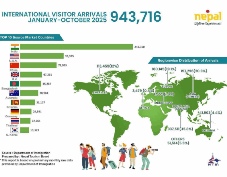 पर्यटन बोर्डका अनुसार, सन् २०२५ मा अमेरिकी र युरोपेली पर्यटकको आगमनदर उल्लेख्य रूपमा बढेको छ भने दक्षिण एसियाली देशहरूबाट निरन्तर उच्च संख्या कायम छ । नेपालले हालका वर्षहरूमा विविध गन्तव्य प्रचार र पर्वतारोहण सहजताका कारण विदेशी पर्यटक आकर्षणमा सुधार देखिएको बोर्डको विश्लेषण छ । यस वर्ष १ सय ७५ टोलीका १ हजार ४५० आरोहीले पर्वतारोहण अनुमति लिएका छन् । यसबाट सरकारले २५ करोड ५१ लाख रुपियाँ बराबरको रोयल्टी संकलन गरेको छ । यस वर्ष १ सय ७५ टोलीका १ हजार ४५० आरोहीले पर्वतारोहण अनुमति लिएका छन् । यसबाट सरकारले २५ करोड ५१ लाख रुपियाँ बराबरको रोयल्टी संकलन गरेको छ ।