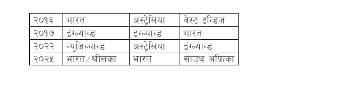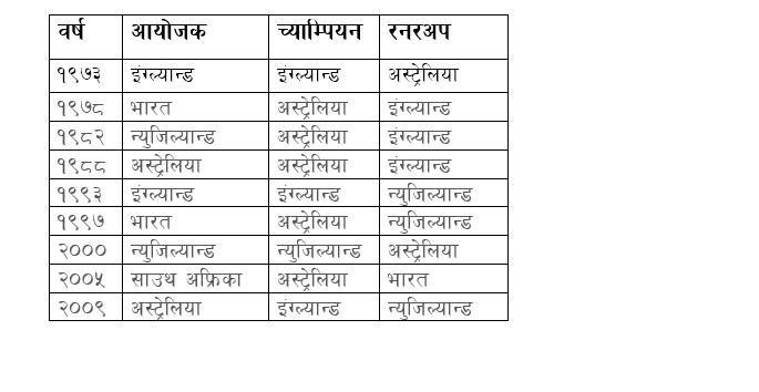 अस्टे«लियाले यस वल्र्ड कपमा निकै दबाव बनाएको छ । अस्टे«लिया सात पटक च्याम्पियन बनेको टिम हो । जसमा टिमले १९७८, १९८२ र १९८८ मा जितेर उपाधिमाथि ह्याट्रिकसमेत गरेको थियो । यस्तै, इंग्ल्यान्डले ४ पटक उपाधि जित्दा न्युजिल्यान्ड र भारतले एक–एक पटक उपाधि जितेका छन् ।