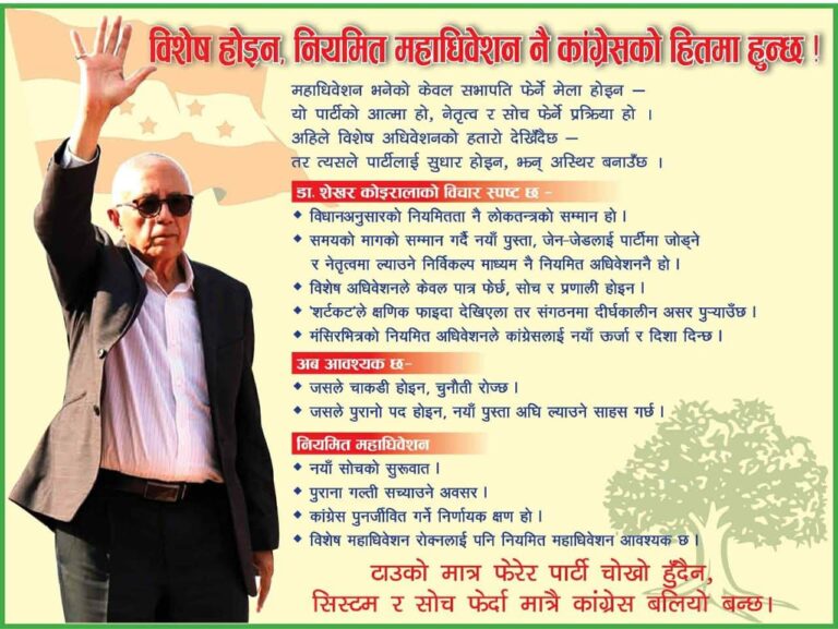 डा. कोइरालाले मंसिरभित्र नियमित महाधिवेशन सम्पन्न गरी कांग्रेसलाई नयाँ ऊर्जा र दिशा दिनुपर्ने आवश्यकता औंल्याएका छन्। उनका अनुसार, “टाउको मात्र फेरेर पार्टी चोखो हुँदैन, सिस्टम र सोच फेर्दा मात्रै कांग्रेस बलियो बन्छ।”