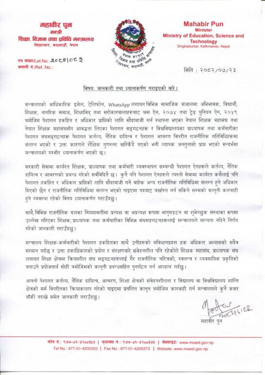 शिक्षा, विज्ञान तथा प्रविधि मन्त्री महावीर पुनले गम्भीर ध्यानकर्षण गराउँदै दलमा संलग्न भएको पाइएमा कारबाही गर्ने बताएका हुन् ।