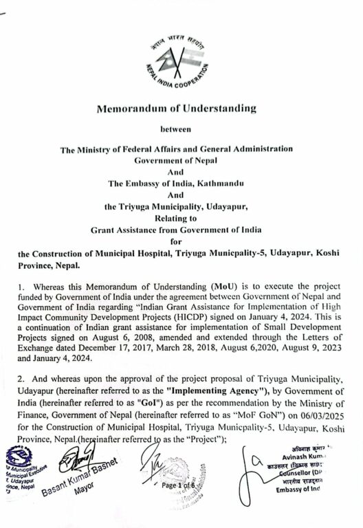 त्रियुगा नगरपालिका र भारतीय दुतावास विच नगर अस्पताल निर्माणका लागि भारत सरकारबाट अनुदान सहयोगको समझदारी पत्रमा हस्ताक्षर भएको छ ।