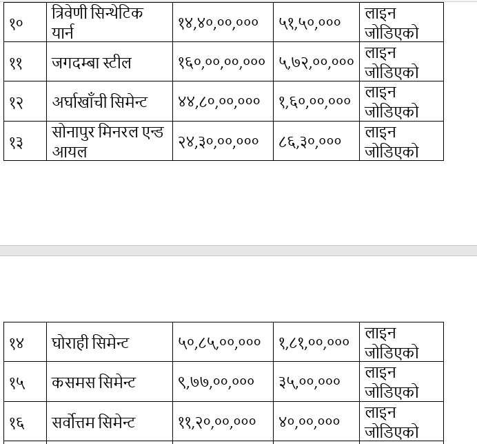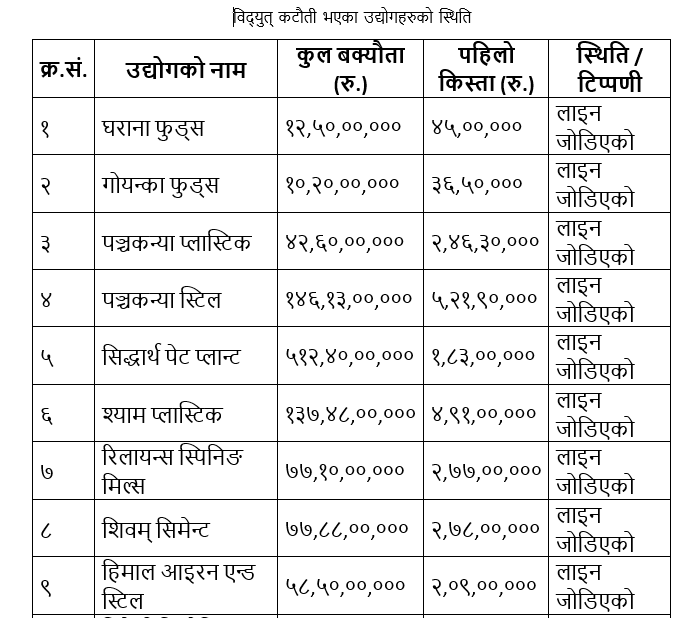जगदम्बा स्टिल्सले ५ करोड ७२ लाख, घोराहीले १ करोड ८१ लाख, अर्घाखाँचीले १ करोड ६० लाख र त्रिवेणी स्पिनिङ मिल्सले १ करोड १४ लाख रुपियाँ पहिलो किस्ता तिरेको प्राधिकरणले जानकारी दिएको छ ।प्राधिकरणले बक्यौता नतिरेका २५ ओटा उद्योगको विद्युत् लाइन कार्तिक ४ गतेदेखि काटेको थियो । तर, नेपाल उद्योग वाणिज्य महासंघको मध्यस्थतामा निकालिएको मध्यमार्गी सहमतिअनुसार उद्योगहरूले बक्यौता २८ किस्तामा तिर्ने र पहिलो किस्तालाई ‘धरौटी’का रूपमा बुझाउने सहमति भएपछि लाइन पुनः जोड्ने प्रक्रिया सुरु भएको हो ।