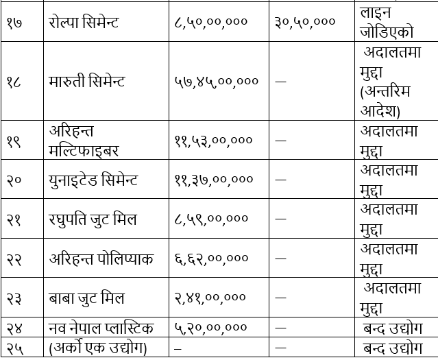 त्यसमध्ये अहिले १७ उद्योगले पहिलो किस्ता बुझाइसकेका छन् । जसको कुल बक्यौता रकम करिब ४ अर्ब ९४ करोड ३० लाख छ । बाँकी ८ उद्योगले अझै किस्ता तिरेका छैनन् । तीमध्ये ६ उद्योग अदालतको अन्तरिम आदेशमा र २ उद्योग बन्द अवस्थामा छन् । जगदम्बा स्टिल्स, अर्घाखाँची सिमेन्ट, घोराही सिमेन्ट, शिवम् सिमेन्ट, रिलायन्स स्पिनिङ, पञ्चकन्या स्टिल, सोनापुर मिनरल्स, घराना फुड्स, गोयन्का फुड्स, सिद्धार्थ पेट प्लास्ट, श्याम प्लास्टिक, सर्वाेत्तम सिमेन्ट, त्रिवेणी सिन्थेटिक्स लगायत छन् । सर्वोच्च अदालतले अर्घाखाँची सिमेन्टको रिट निवेदनमा अन्तरिम आदेश अस्वीकार गर्दै कात्तिक ३० गते विस्तृत सुनुवाइका लागि दुवै पक्षलाई उपस्थित हुन आदेश दिएको छ ।