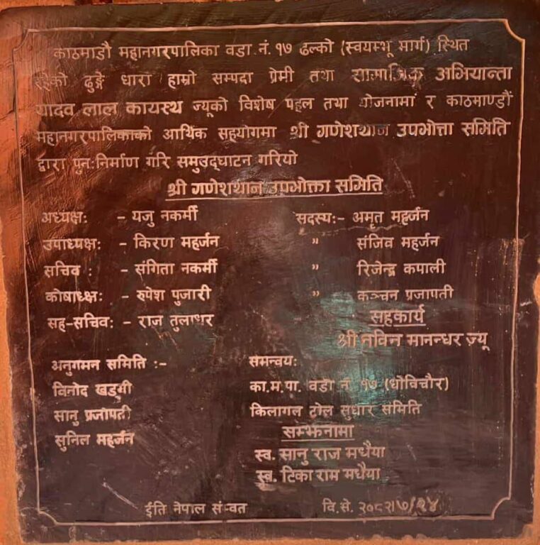 सम्पदा अभियन्ता यादवलाल कायस्थको पहलमा काठमाडौं महानगरपालिकाको १४ लाख रुपियाँको बजेटमा सो ढुंगेधारा पुनःनिर्माण गरिएकोे हो । यजु नकर्मीको अध्यक्षतामा पुनःनिर्माण सम्पन्न भएको थियो । अभियन्ता कायस्थका अनुसार पुनःनिर्माण सुरु भएको ७ महिनामा धाराबाट पानी आउन थालेको छ ।