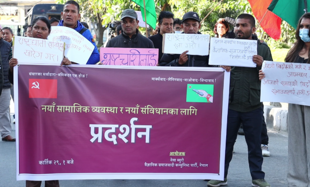 वैज्ञानिक समाजवादी कम्युनिष्ट पार्टी, नेपालले नयाँ सामाजिक व्यवस्था र नयाँ संविधानको माग गर्दै शनिवार दिउँसो माईतीघरमा प्रदर्शन गरेको छ।