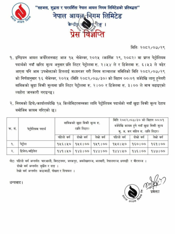 नेपाल आयल निगमले पेट्रोलियम पदार्थको मूल्य बढाएको छ । निगमले आइतबार (कात्तिक ३०) गते बिहानदेखि लागू हुने गरी पेट्रोलको मूल्य लिटरमा दुई रुपैयाँले बढाएको छ । डिजेलको मूल्य लिटरमा तीन रुपैयाँले बढाइएको हो ।
